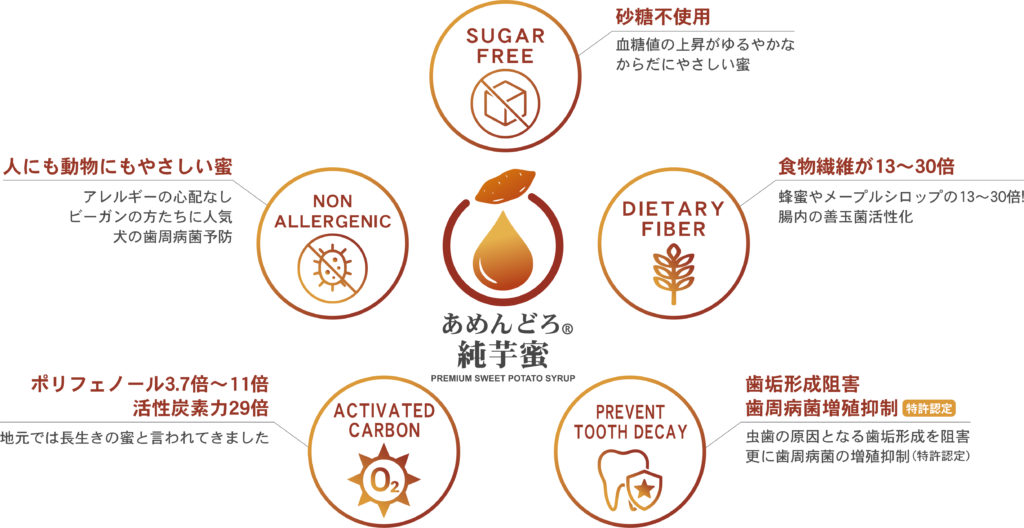 2023年、東京歯科大学・三浦准教授と元鹿児島女子短期大学・吉元博士の研究チームにより、あめんどろ純芋蜜が、虫歯の原因となる歯垢形成を阻害するとともに歯周病菌の増殖を抑制する機能性をもつことが発見され特許認定されました(特許第7340191号)。