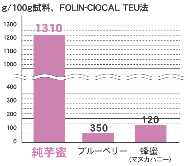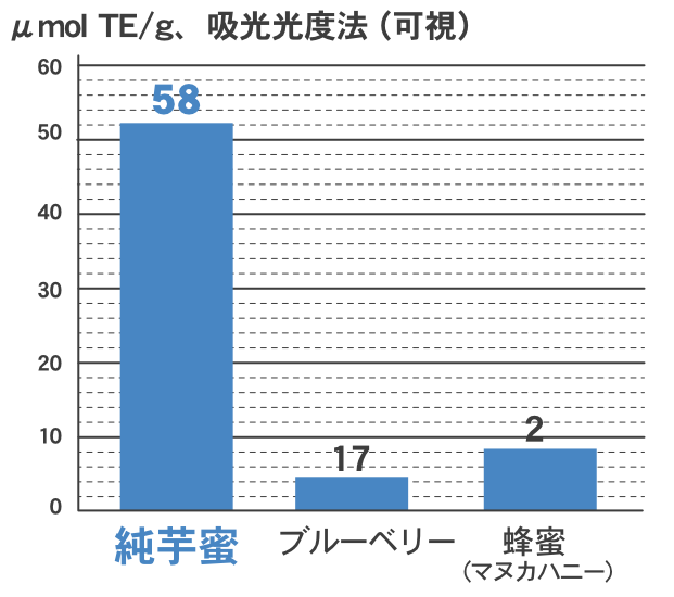 「あめんどろ純芋蜜」紫のポリフェノール含量は、ブルーベリーの約3.7倍、蜂蜜(マヌカハニー)の約11倍。さらに、からだのサビつき、老化の原因とされる活性酸素を消去する抗酸化力(DPPHラジカル消去能)は蜂蜜(マヌカハニー)の約29倍です。(※財団法人日本食品分析センター調べ)